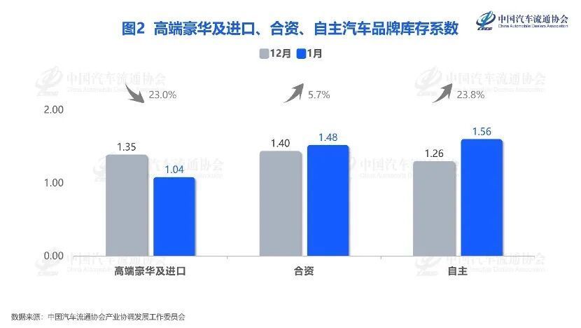 高端豪华&入口品牌库存统共为1.04,库存统共环比下落23.0%,参加合理区间;结伙品牌库存统共为1.48,环比飞腾5.7%;自主品牌库存统共为1.56,环比飞腾23.8%,高于告诫线。