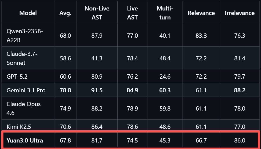 能干多法子器具调用与协调,为自动化履行复杂任务打下坚实基础,是Agent应用关节材干,在智能体器具调用方面,Yuan3.0 Ultra施展平衡,在器具调用评测BFCL V3中平均得分67.8%。