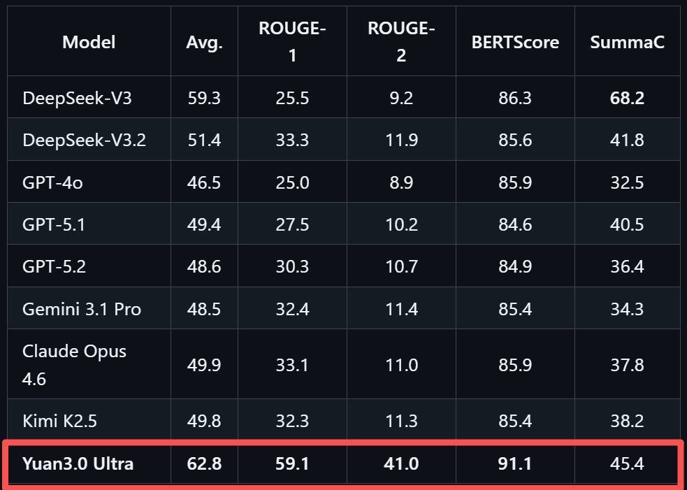 在文本纲领生成评测SummEval中,Yuan3.0 Ultra平均精度62.8%,施展出色。这一测试从词汇重复、语义相似度与事实一致性三个维度轮廓评估纲领质料,是智能体应用中历史信息压缩材干的热切参考。