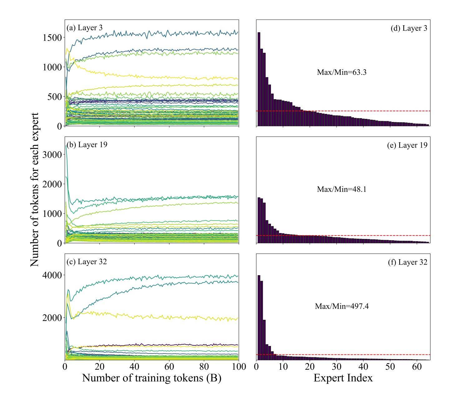 ▲预西宾进程中各层各人token散布的演化趋势(左列)及踏实阶段负载散布(右列)
