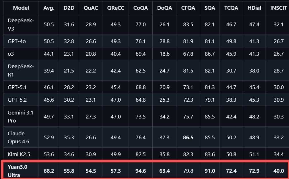 ChatRAG涵盖长文本检索、随笔本与结构化检索及维基百科检索,Yuan3.0 Ultra在这项测试中的平均准确率68.2%,10项任务中9项位居首位。
