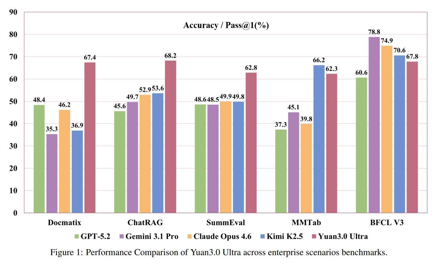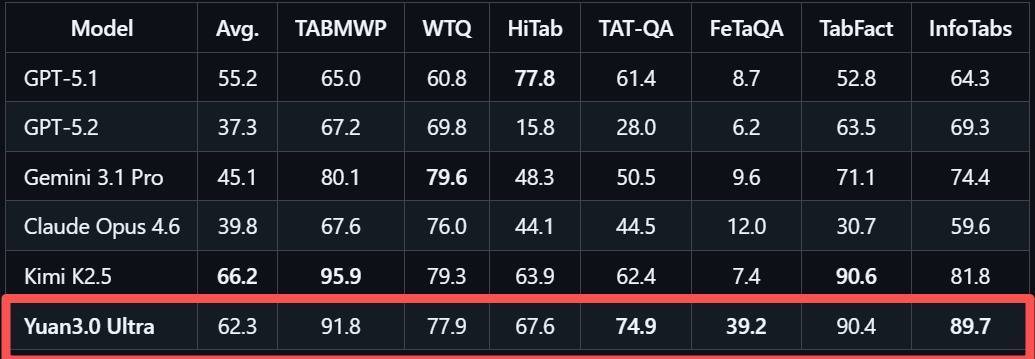 多模态复杂表格意会评测MMTab隐蔽表格问答、事实核查、长文本表格处理等多个任务类型,Yuan3.0 Ultra在这一测试中以62.3%的平均准确率超越Claude Opus 4.6和Gemini 3.1 Pro。